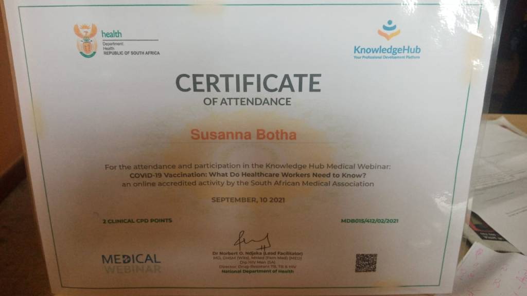 We would like to congratulate our provincial coordinator, Susanna Botha, for participating in the Knowledge Hub Medical Webinar titled: “Covid-19 Vaccination: What Do Healthcare Workers Need to Know?”.